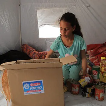 Help feed a displaced family with a complete pack of essential meal supplies. Each pack includes rice, pasta, canned vegetables and fruit, canned meats and fish, cooking oil, lentils, flour, sugar, salt, milk or powdered milk, tea and coffee, and bread-making ingredients. Your donation brings comfort, nutrition, and relief to families in crisis.